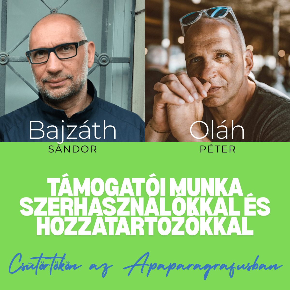 Bajzáth Sándor (addikt.hu) szociális munkás, addiktológiai konzulens és gyászcsoportvezető és író, Oláh Péter pedig a Megálló Csoport Alapítvány Alapítvány kuratóriumi elnöke és programvezetője.
